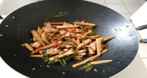 Mettez une cuillerée à soupe d’huile d’olive dans le wok et faites cuire les pois mange-tout, réservez. Ensuite, ajoutez une nouvelle cuillerée d’huile d’olive et faites cuire les mini-épis de maïs en ajoutant un peu d’eau, réservez. Faites cuire maintenant les bâtonnets de carotte, puis réservez.