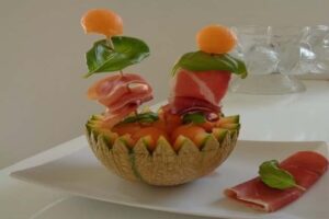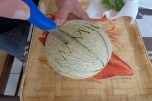 Lavez les melons. Coupez légèrement les extrémités des melons pour qu’ils tiennent dans l’assiette.