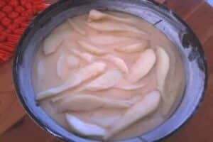 si vous coupez vos poires en lamelles à l’avance, je vous conseille de les arrosez avec un jus de citron car la poire est un fruit qui s’oxyde très vite.