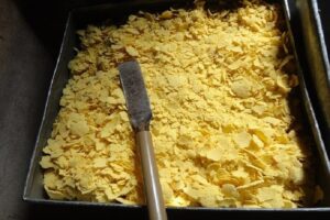 Tamisez la farine, l’incorporer au mélange d’œufs et de sucre, ajoutez ensuite la maïzena, la levure et le sel, bien mélanger le tout. Préchauffez votre four thermostat ⅚.