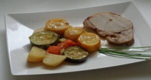 Dans un faitout allant au four, faites dorer le rôti de porc sur le pourtour et sur les deux faces dans un peu d'huile d'olive puis, réservez.Maintenant, faites suer les épices (ail, oignon), ajoutez un peu d'eau puis, les légumes (courgettes jaune et verte, carottes et pommes de terre).Pour terminer, remettez le rôti de porc dans le faitout que vous couvrez puis, enfournez 45 minutes à thermostat 180°.En cuisant votre rôti de porc de cette façon, vous allez obtenir une viande tendre et moelleuse en bouche.