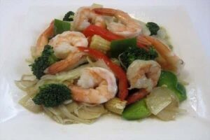 Ensuite, faites revenir les crevettes, incorporez l’oignon coupé en lamelles, ajoutez le veet sing , le sel chinois, la poudre de manioc, bien remuer, puis les légumes un à un en mélangeant le tout délicatement.