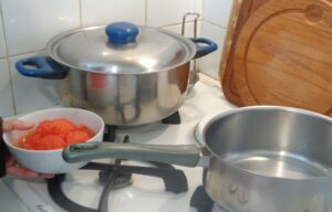 Tout d'abord, commencez par monder les tomates, épluchez-les, ôtez les pédoncules et coupez-les en quartiers.Ensuite, épluchez la gousse d'ail que vous hachez et l'oignon que vous émincez.